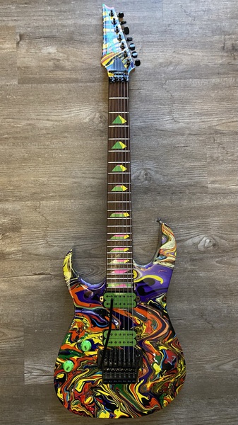 We were given total freedom to come up with a paint job for this rarer Ibanez! Along with the refinish, we installed a new Floyd, that had been converted to a lefty trem since Ibanez never offered an Edge for the 7 string lefty. Matching headstock and disappearing pyramid (stickers) round out this fantastic beast!